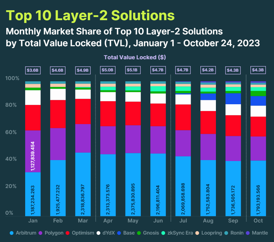 تمثل ARB و POL وOP معًا 73.8٪ من القيمة الإجمالية المقفلة لأفضل 10 حلول للطبقة الثانية. ومع ذلك، فقد حدث انخفاض طفيف من ذروتها السنوية التي بلغت 86.9٪ في مارس 2023. يمكن أن يعزى هذا الانخفاض إلى إطلاق طبقة-2 الجديدة مثل Base و zkSync Era و Mantle و ApeX Protocol و StarkNet و Linea، التي تمكنت من الاستيلاء على حصة السوق من الأعلى ثلاثة .