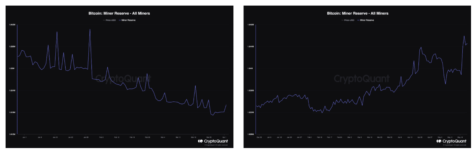 يُظهر الرسم البياني الموجود على اليسار احتياطيات عمال المناجم التي سبقت التنصيف في عام 2024، بينما يُظهر الرسم البياني الموجود على اليمين الاحتياطيات الخاصة بالتنصيف في عام 2020. من الواضح أن القائمين بالتعدين بدأوا في تفريغ احتياطياتهم في وقت سابق من هذه الدورة، مما يشير إلى أنهم قد يعتقدون أن ارتفاع أسعار البيتكوين قد بدأ في التراجع قبل النصف في عام 2024.