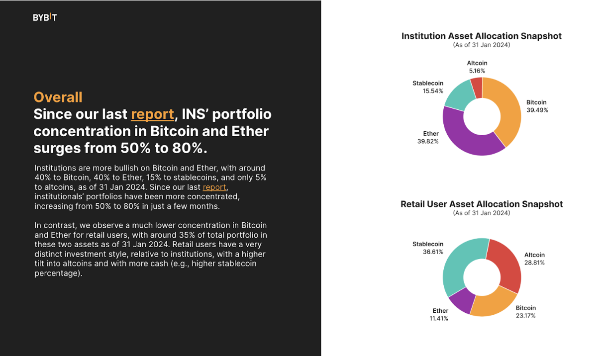 وفقًا لتقرير تخصيص الأصول، خصص المستثمرون المزيد من المراكز لبيتكوين منذ سبتمبر الماضي، بمتوسط 40% و24% من إجمالي الأصول هو عملة البيتكوين من قبل المؤسسات والمستثمرين الأفراد، على التوالي، اعتبارًا من 31 يناير 2024.