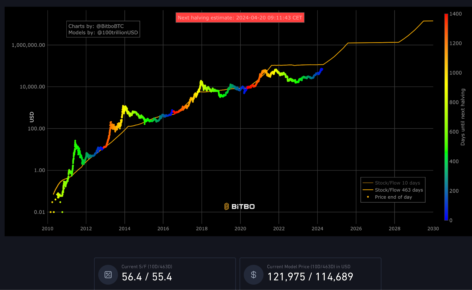 يتم حساب نسبة S2F عن طريق قسمة العرض المتداول للسلعة على إنتاجها السنوي، مما يؤدي إلى قياس الندرة. تبلغ نسبة S2F في Bitcoin حوالي 56 قبل التنصيف القادم، بينما تبلغ نسبة الذهب 60. وبعد التنصيف في أبريل 2024، من المتوقع أن تتضاعف نسبة S2F في Bitcoin إلى 112.