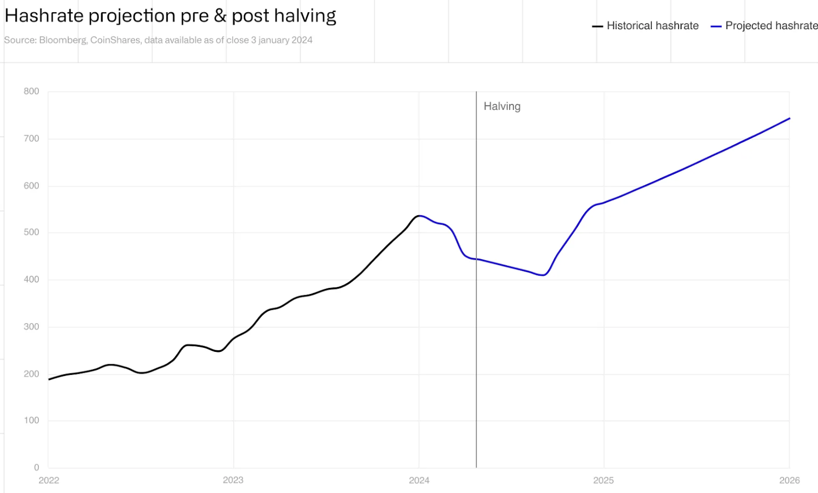 بعد النصف، من المتوقع أن يرتفع معدل تجزئة البيتكوين، مما يزيد من تكاليف إنتاج عمال المناجم. تقدر CoinShares أن التكاليف المباشرة لإنتاج عملة بيتكوين واحدة سترتفع بين 28 ألف دولار و38 ألف دولار بعد التنصيف، في حين توقعت شركة JPMorgan Chase & Co مؤخرًا تكلفة 42 ألف دولار لكل إنتاج لعملة بيتكوين واحدة بعد أبريل 2024.